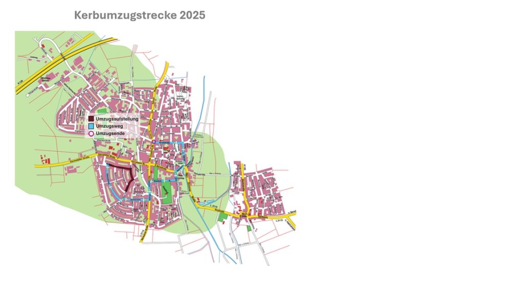 Für unseren traditionellen Umzug hier die Umzugsstrecke und die Teilnehmer mit ihrer Zugnummer. Eine Bitte an die Teilnehmer – fahrt über den Gehrenweg an, und seit pünktlich an der Aufstellung.
